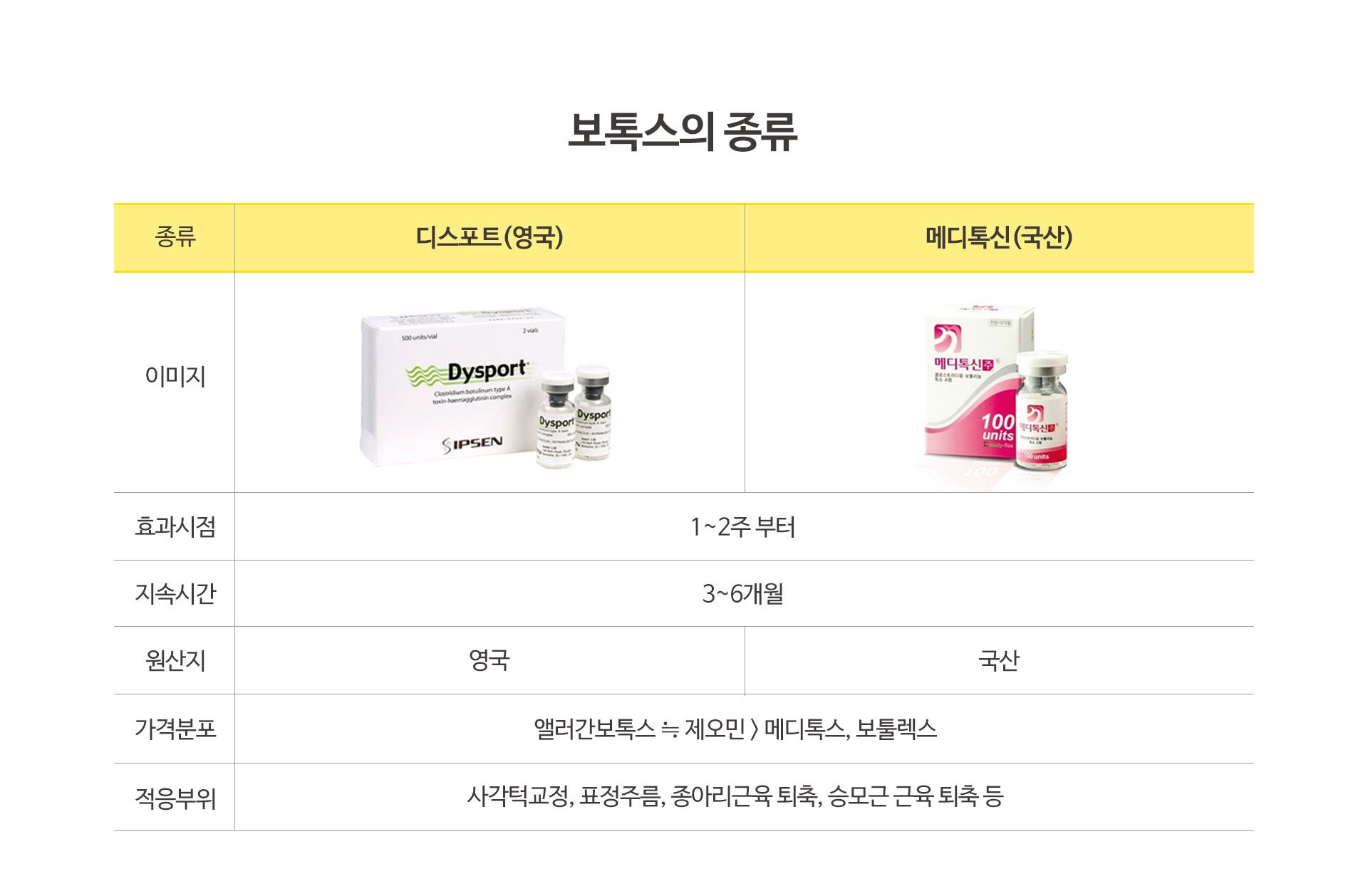 | 종류 | 보톡스(미국) | 메디톡신(국산) | 나보타(국산) | 이노톡스(국산) | |||||